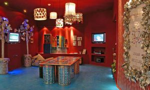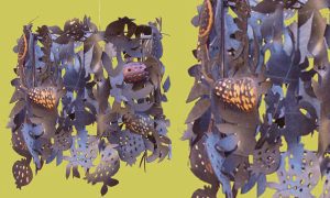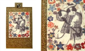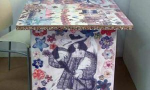 La mesa se ubica contra cualquier pared rebatiéndola hacia arriba para generar un plano decorativo o bien hacia abajo como tabla de encuentros familiares, de amigos, mateadas varias, escritorio y tantos otros usos como cualquier mesa digna pueda ofrecer. Se produce en tetraplak, un material de tetrabrik residual que proviene del proceso de envasado y bobinas que presentan defectos de impresión o corte. Este material, que no es degradable naturalmente, logra productos terminados que no impactan en el medio ambiente y encuentran de esta manera una nueva forma de vida. Las imágenes estampadas sobre las placas son impresiones de originales de collages hecho en papel.