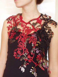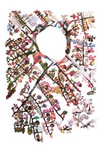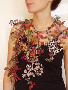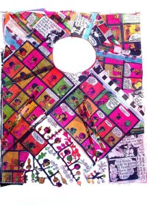 Qué nos une. Collar textil reversible. Mención especial en el Primer concurso de joyería contemporánea Argentina. Convocatoria de la asociación Joyeros Argentinos. Nos une el humor. La sabiduría urbana de Mafalda y la gauchesca de Inodoro. Collage hecho con hojas de historietas cortado con tijera. Tela, transfers, imanes.