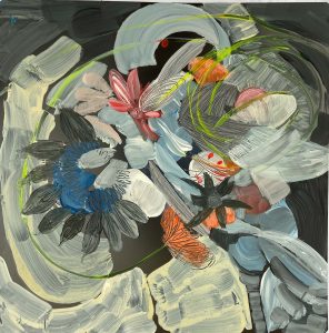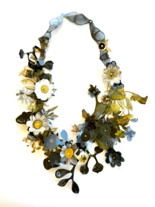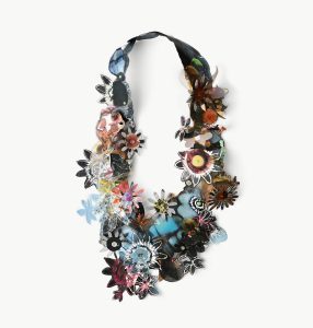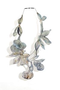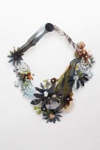 Pinté y dibujé sus formas con mis tijeras como una naturalista darwiniana y en ese intento, la flora devino collar. Acrílico sobre radiografías.